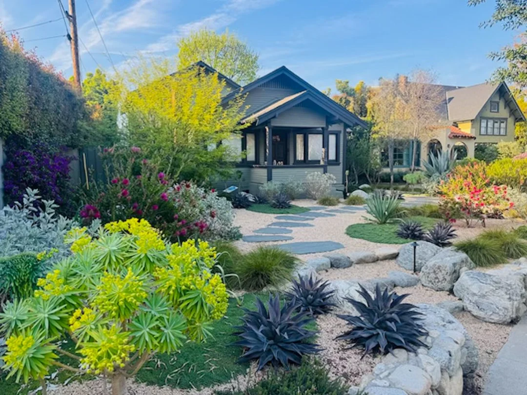 When Walter and Cindy Okitsu purchased 1204 Marengo Ave., the property at the southeast corner of Marengo Avenue and Monterey Road, it featured a large, water-intensive lawn. In 2015, they began transitioning to drought-tolerant landscaping, replacing part of the lawn with low-water plantings, including a row of Mexican sage along the Monterey Road parkway. The result, while popular with neighbors and hummingbirds, eventually became overgrown and unruly. In 2024, the Okitsus removed the remaining lawn and re-landscaped the earlier area, installing Kurapia, a low-water groundcover that mimics turf. They also added gravel elements and a variety of flowering plants to enhance visual appeal. Given that the adjacent sidewalk leads to a nearby elementary school and sees heavy foot traffic—especially on Halloween—the curbside landscaping was designed with durability and accessibility in mind. A few Mexican sage plants were retained, still welcoming the neighborhood’s hummingbirds.